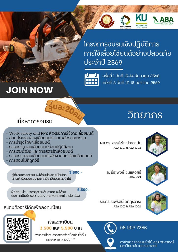 พิเศษสำหรับผู้ที่ผ่านการอบรม สามารถสมัครเข้าร่วมทดสอบการใช้งานเลื่อยโซ่ยนต์ตามมาตรฐานระดับสากล ได้ในช่วงเดือนกุมภาพันธ์ 2569 ผู้ที่สอบผ่านจะได้รับประกาศนียบัตรจากสถาบัน ABA ระดับ ICC1 ไป