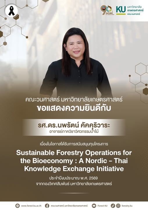 ขอแสดงความยินดีกับ รศ.ดร.นพรัตน์ คัคคุริวาระ อาจารย์ภาควิชาวิศวกรรมป่าไม้ เนื่องในโอกาสได้รับการสนับสนุนทุนโครงการ Sustainable Forestry Operations for the Bioeconomy : A Nordic – Thai Knowledge Exchange Initiative ประจำปีงบประมาณ พ.ศ. 2569 จากกองวิเทศสัมพันธ์ มหาวิทยาลัยเกษตรศาสตร์